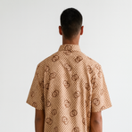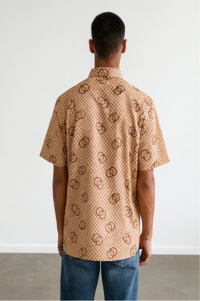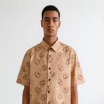 This beige short-sleeve shirt features a repeating geometric background pattern with circular motifs, giving it a luxury-inspired monogram effect. The neutral tone and soft prin...