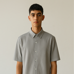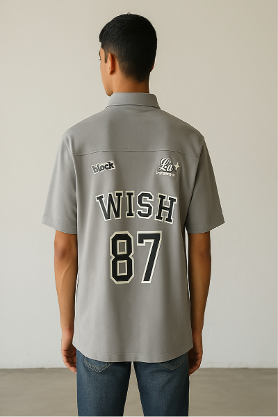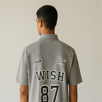 A sleek grey short-sleeve shirt featuring a clean front and bold varsity-inspired back print with “WISH 87” lettering. Minimalist in the front, sporty at the back, this shirt is perfect for casual streetwear styling.
