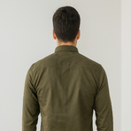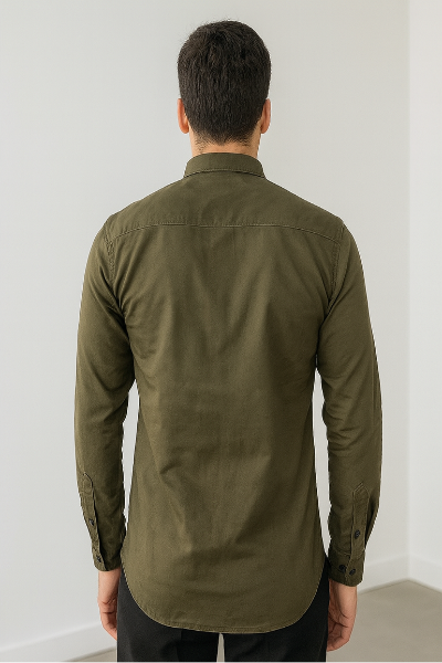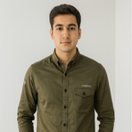 A classic olive green shirt with utility-inspired details, including a flap chest pocket and subtle branding. Long sleeves and tailored cut make it a wardrobe essential.