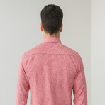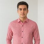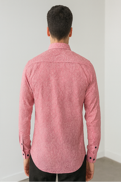 A refined long-sleeve shirt in pink, featuring an all-over paisley textured print. Slim fit with button closure and contrast buttons, perfect for both formal and festive occasions.