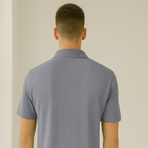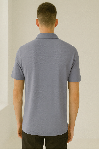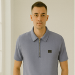 A modern slate blue polo featuring a sleek half-zip closure and minimal branding, perfect for a clean, contemporary wardrobe.