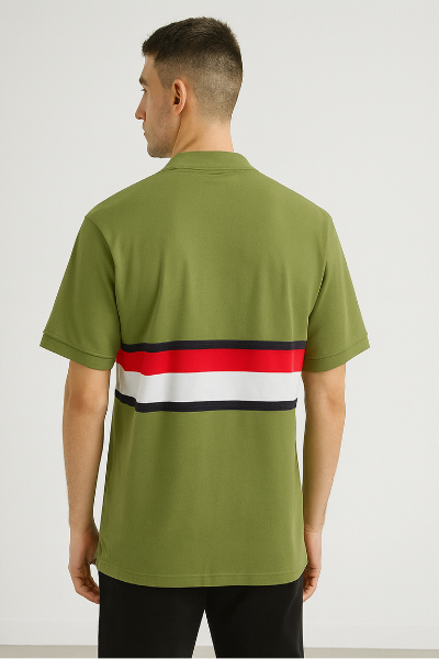 A sporty green polo T-shirt designed with bold horizontal stripes in red, white, and navy across the chest. Featuring the U.S. Polo Assn. logo, this cotton-blend polo offers a casual yet athletic appeal with short sleeves and a button placket.