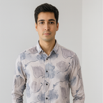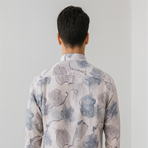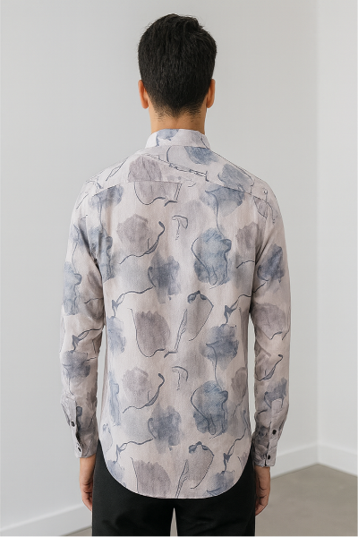 A soft beige shirt with a watercolor-inspired floral print in blue and grey hues. Lightweight fabric and button closure make it ideal for a relaxed, stylish look.