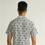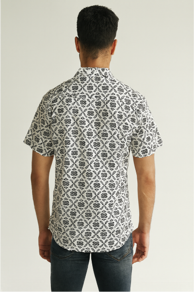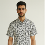 A contemporary short-sleeve shirt in white with intricate black floral motifs. A versatile pick for both casual and semi-formal looks.