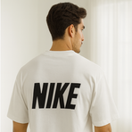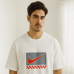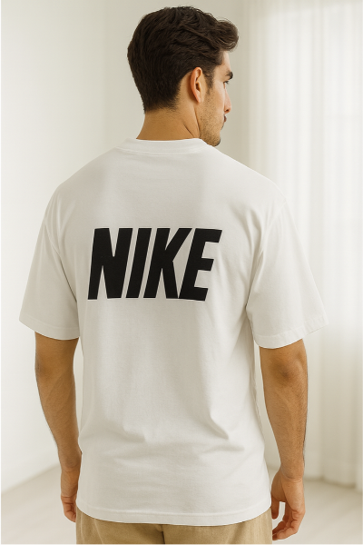 A white oversized crew-neck t-shirt with a red Nike swoosh graphic on the front and bold black NIKE lettering on the back. Sporty and streetwear ready.