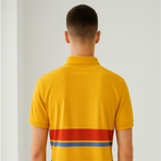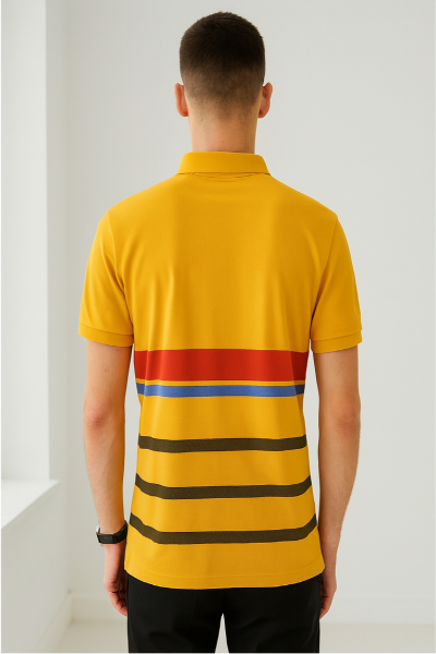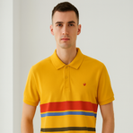 This yellow polo t-shirt is styled with a grey collar accented with red stripes. A subtle chest emblem completes the look, making it ideal for smart-casual occasions.