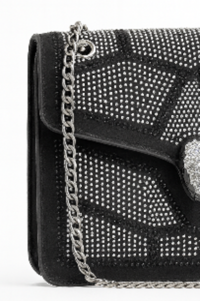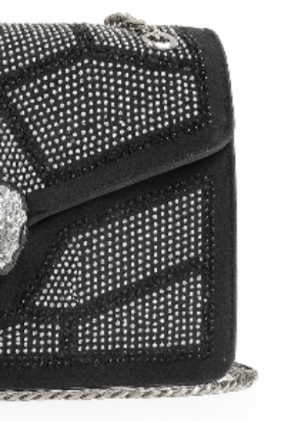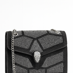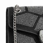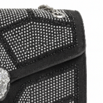 A stunning black handbag designed with shimmering crystal studs in geometric patterns. Features a silver-tone chain strap and a textured silver clasp centerpiece. Perfect for evening parties and luxury occasions.