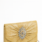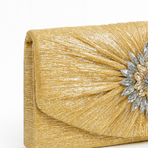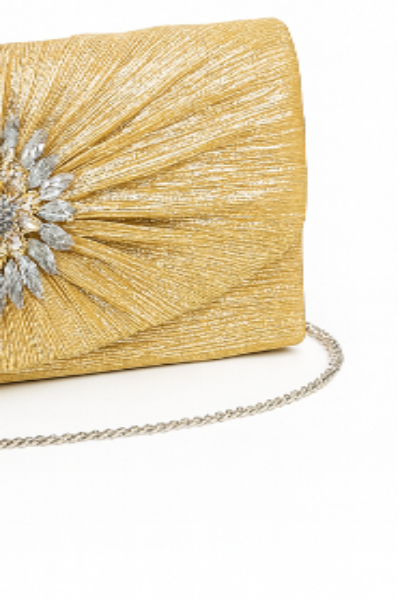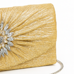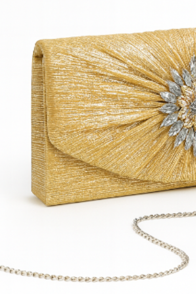 A glamorous golden clutch with a pleated metallic fabric finish. The centerpiece is a floral crystal brooch with silver and gold accents. Comes with a slim silver chain strap, ideal for weddings and festive events.