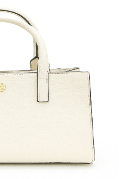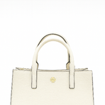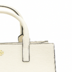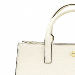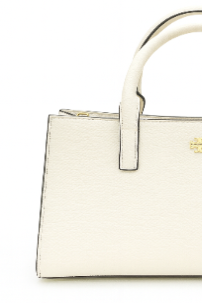 A structured tote bag in white leather with clean lines and gold Tory Burch emblem. Features dual top handles and a spacious interior for everyday elegance.