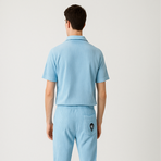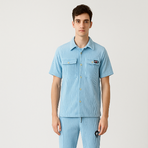 A modern light blue corduroy co-ord set featuring a button-up short-sleeve shirt with flap pockets and embroidered chest detail, paired with slim-fit jogger-style pants. Finished with a clean, minimal silhouette for casual streetwear elegance.