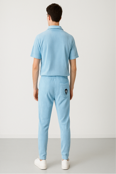 A modern sky blue co-ord set crafted from soft ribbed fabric. Includes a loose-fit t-shirt with dropped shoulders and matching joggers with an elastic waistband. Perfect for casual outings, loungin...