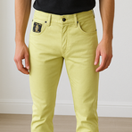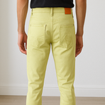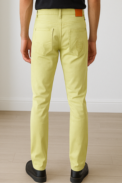 A bold slim-fit jeans in vibrant lemon yellow, styled with classic five-pocket construction. Features subtle branding accents and a modern tailored cut, making it a standout piece for fashion-forward streetwear.