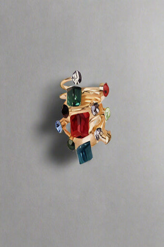 A bold gold-plated ring adorned with multiple vibrant colored gems in red, green, and blue. Designed for fashion-forward individuals who love a pop of color.