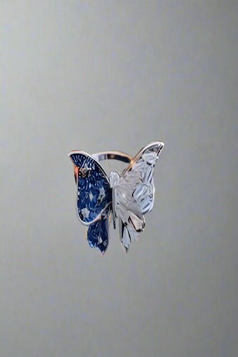 A stunning statement ring featuring a butterfly design with one wing adorned in deep blue sapphires and the other in shimmering diamonds. The two-tone design creates a sophisticated and artistic look, perfect for evening wear or luxury occasions.