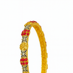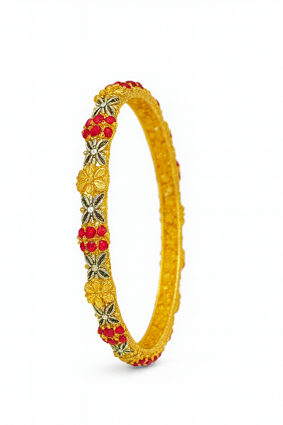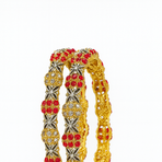 A pair of exquisite gold bangles adorned with bright red stones and diamond-studded floral motifs. The rich combination of gold, silver, and red gives these bangles a royal and festive touch.
