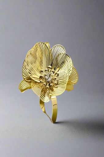 A luxury ring featuring a detailed gold floral design with delicate textures and a cluster of white stones in the center. Perfect for bold fashion statements.