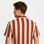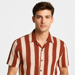 A casual short-sleeve shirt with vertical wavy stripes in earthy brown and beige tones. The minimal button-up design with small dotted patterns inside stripes gives it a retro yet modern appeal, perfect for casual and vacation wear.