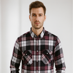A bold burgundy and grey checked shirt with dual flap chest pockets and button-down detailing. A rugged yet fashionable choice for everyday wear.