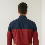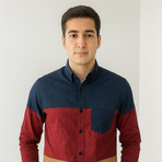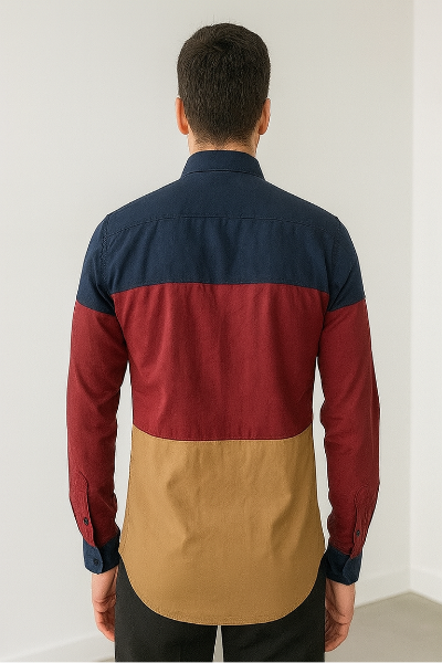 A striking shirt with navy, maroon, and camel color-block panels. Full sleeves with button closure, blending modern streetwear style with casual sophistication.