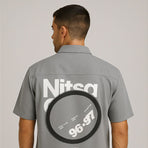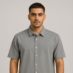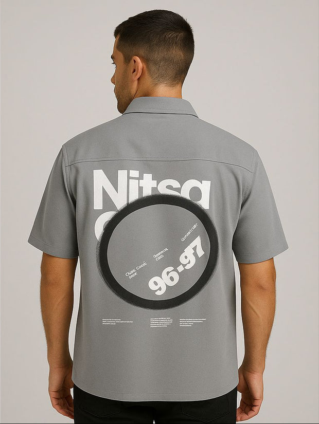 A contemporary grey short-sleeve shirt with a clean front button closure and a bold graphic design at the back, showcasing text and circular artwork for a modern streetwear vibe. The minimalist front contrasts perfectly with the statement back, making it a versatile piece for fashion-forward individuals.