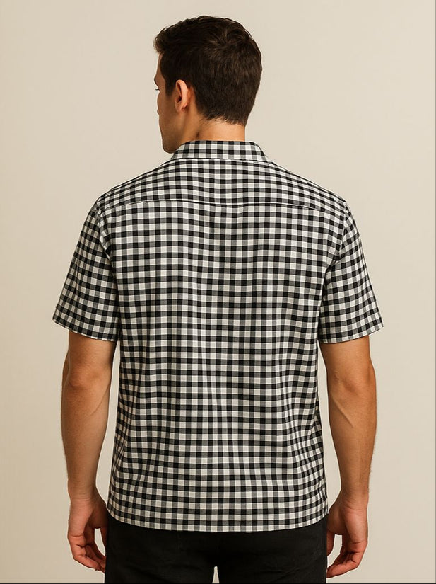 • Classic Black & White Checkered Cuban Collar Shirt for Men