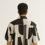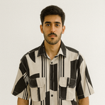 A stylish black-and-white shirt with bold abstract block prints and vertical stripes. Featuring flap pockets, it balances casual and edgy streetwear.