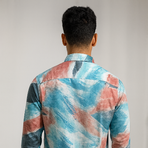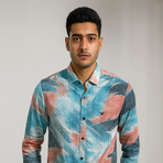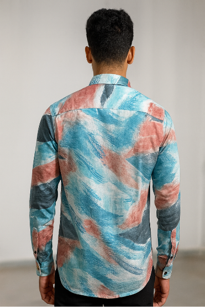 A multicolor full-sleeve shirt featuring abstract strokes in blue, red, and grey tones. Lightweight fabric and slim-fit design for a trendy casual vibe.