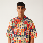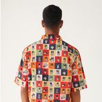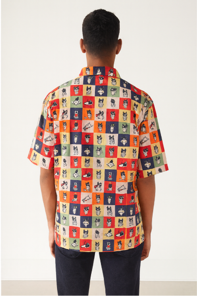 A playful oversized shirt featuring a colorful checkered patch design with cartoon dog and cat illustrations in each square. Its bright tones of red, yellow, green, navy, and cream make it a fun, standout piece for streetwear and casual outings.