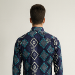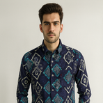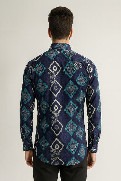 A bold navy blue shirt featuring a striking geometric diamond pattern in turquoise and white. Designed with a sharp collar and button-down closure, this shirt blends modern prints with a stylish fit, perfect for evening outings or casual-smart occasions.