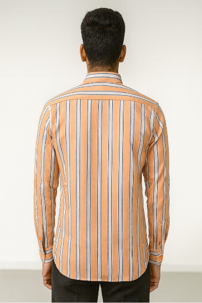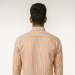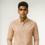 A button-down shirt with vertical orange, blue, and white stripes. Features a unique diagonal striped chest pocket and orange buttons, adding a modern twist to a classic striped design.