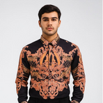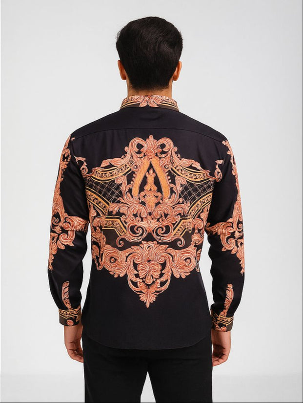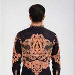 Step into refined elegance with this luxury baroque-style shirt, featuring an intricate copper ornamental design set against a rich black base. The detailed scrollwork and symmetrical motifs on the front and back create a bold, sophisticated look inspired by Renaissance artistry and royal architecture. Designed with a structured collar, button-down closure, and full sleeves, this shirt delivers a striking blend of classic opulence and modern fashion. Perfect for evening wear, parties, and upscale events, it’s a standout piece for men who love making a powerful fashion statement.