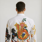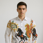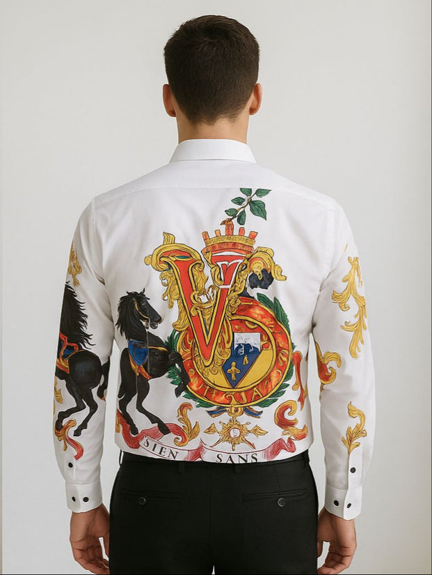 Turn heads with this luxury statement shirt featuring an opulent royal crest and baroque-style artwork. The front showcases striking black horse prints combined with elaborate gold ornamental patterns and a bold “V” crest design that continues seamlessly to the back. Accented with vibrant colors, including gold, red, blue, and green, this shirt radiates regal sophistication and artistic flair. Designed with a button-down closure, structured collar, and long sleeves, it is perfect for parties, upscale gatherings, or fashion-forward looks. A shirt that blends luxury heritage style with modern boldness.