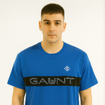 A bold blue crew neck T-shirt featuring a sleek black chest stripe with "GAUNT" typography and a small emblem for a sporty, urban look.