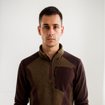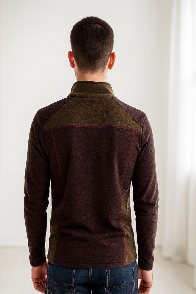 A rugged brown and olive panelled sweatshirt with a half-zip closure and chest pocket. Adventure-inspired styling, built for casual comfort