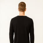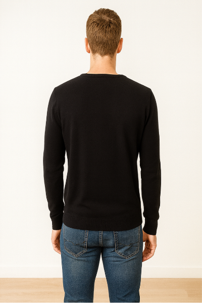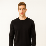 A timeless black crew-neck sweater with a simple, clean design. A must-have wardrobe staple for effortless styling.
