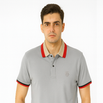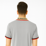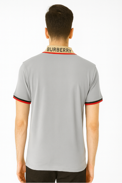 A refined grey polo t-shirt with stylish red and beige contrast collar and sleeve piping. Designed with subtle chest embroidery and "Burberry" lettering on the back collar, it delivers a premium casual look.