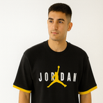 This black t-shirt pays homage to the iconic Jordan brand, with a bold Jumpman logo and “Jordan” text in white. Yellow sleeve trims and detailing add a striking contrast, perfect for sporty casual styling.
