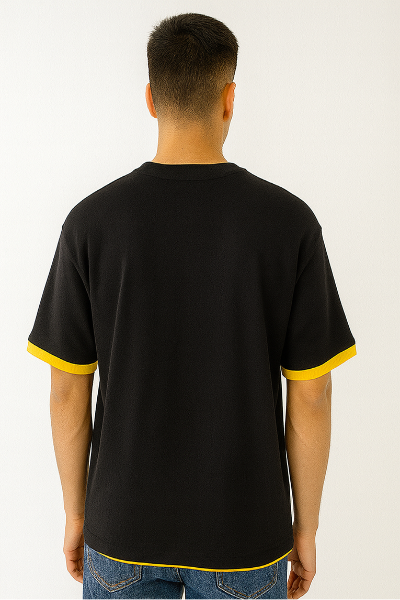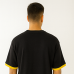 A modern two-tone T-shirt with a half-button Henley neckline. The yellow upper pairs with a black lower section, featuring bold motivational text and graphic signature print.