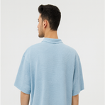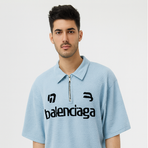 A relaxed-fit light blue polo t-shirt with a half-zip closure and bold Balenciaga branding on the chest. Designed with textured fabric for a modern streetwear look.
