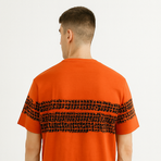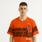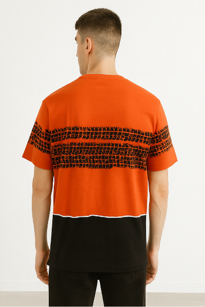 This unique red and black color-blocked T-shirt features bold tire track-inspired graphic stripes across the chest, a small button placket, and "SKITE" branding. Designed with a streetwear aesthetic, it offers a trendy urban edge.