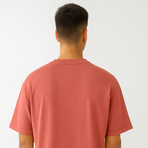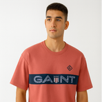 A bold red crew-neck T-shirt featuring a navy chest stripe with "GAINT" branding in a distressed print style. Made with soft cotton fabric, it delivers a relaxed, casual fit with a sporty yet fashionable design.