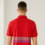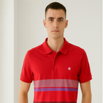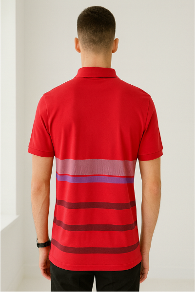A bold red polo t-shirt featuring layered horizontal stripes in maroon and purple shades, blending modern casual with smart style.