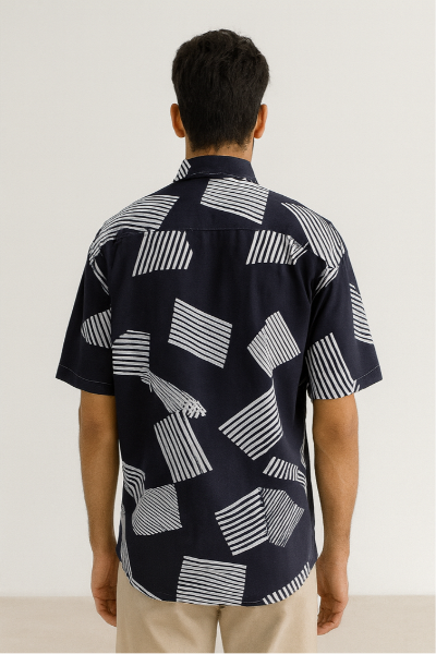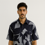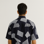A fashionable short-sleeve shirt with abstract striped patch patterns in white on navy. The down-shoulder cut adds a modern streetwear touch.