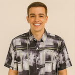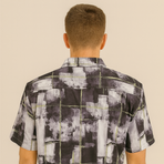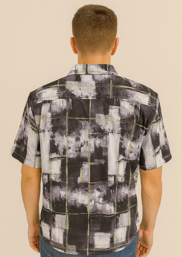 A short-sleeve shirt with abstract plaid brushstroke design in black, gray, and subtle green highlights. Modern artistic style, versatile for casual outings.