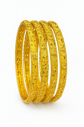 A set of four antique-style bangles with embossed floral patterns. Rich golden hue with detailed craftsmanship.