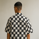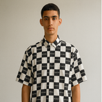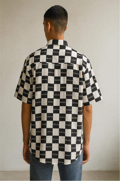 A striking short-sleeve shirt featuring a bold black-and-white checkerboard print with embedded text graphics. Its eye-catching design brings a streetwear edge, making it perfect for statement outfits and casual layering.