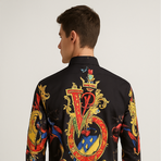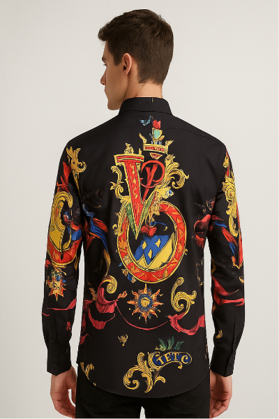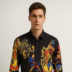 A luxurious long-sleeve shirt featuring a striking black base with bold baroque-inspired multicolor artwork. The intricate design includes ornate scrolls, crests, and heraldic motifs in rich shades of gold, red, blue, and yellow. Tailored with a sharp collar and button-down closure, this shirt blends high-fashion elegance with a statement-making edge — perfect for evening wear, events, or upscale styling.