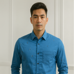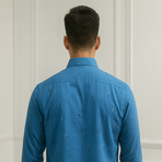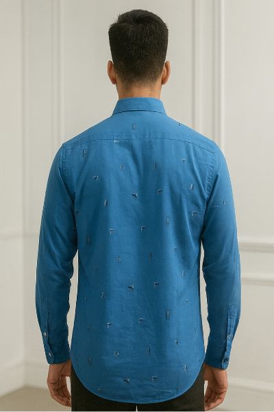 Bright blue shirt with subtle scattered embroidery motifs. Features a chest pocket, buttoned cuffs, and a modern casual fit for a stylish upgrade to everyday looks.