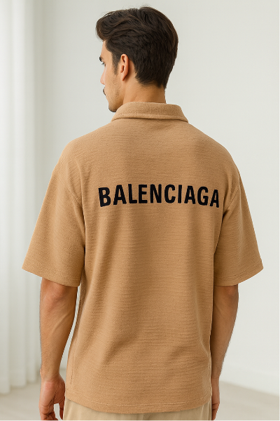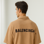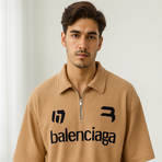A camel brown oversized polo t-shirt featuring Balenciaga branding on the front and back. Complete with a half-zip collar for a bold, high-fashion look.