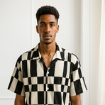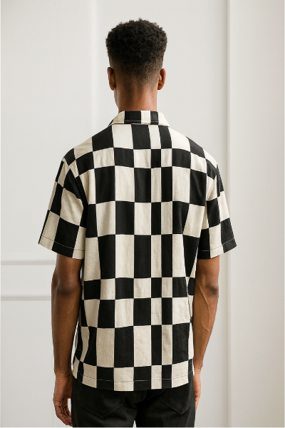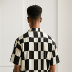 A bold short-sleeve shirt featuring a striking black and white checkerboard pattern. Designed with a relaxed fit, button-down closure, and a casual collar, this shirt delivers a modern streetwear edge while keeping things versatile for casual outings.